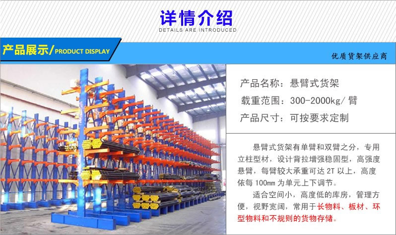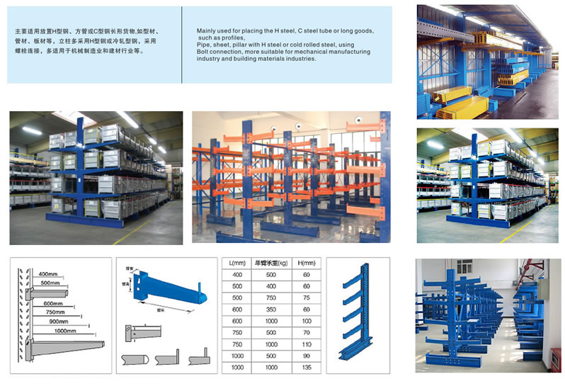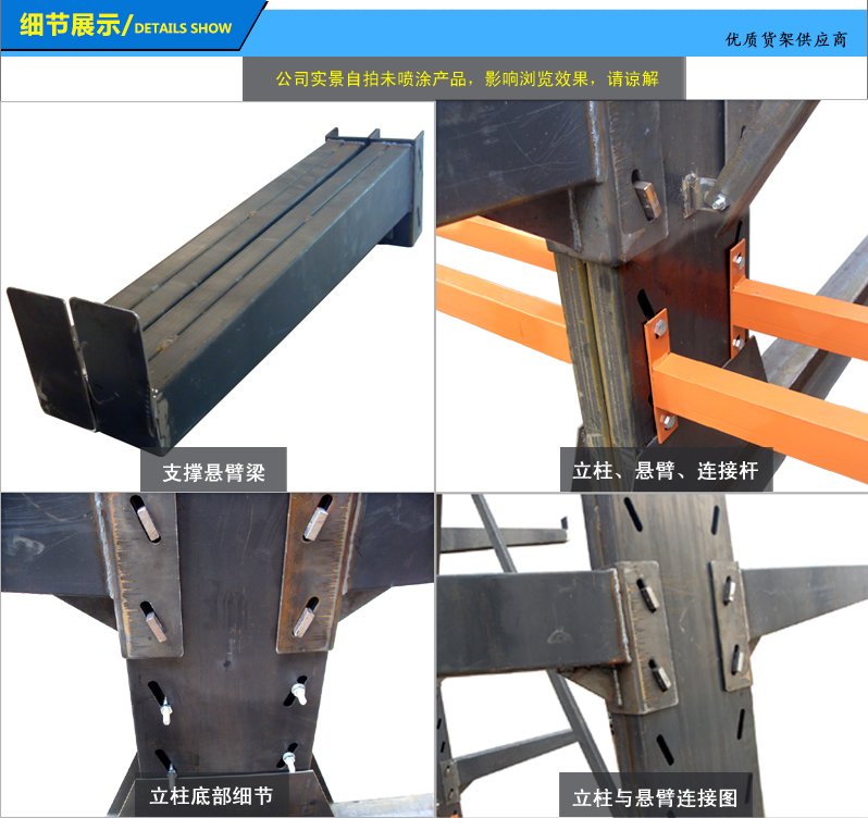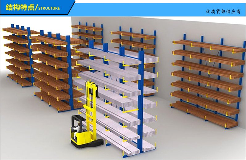 8、懸臂貨架并不是一個獨立的個體使用的貨架,可以由多個立柱連接來組成一列貨架使用,這樣子每個貨架單元就可以分類儲存不同類別的貨物,高效存儲木料、管材、長條物等類似產(chǎn)品。立柱上面帶有由3-4個懸臂和縱梁相連組成可調(diào)試鉗位夾。